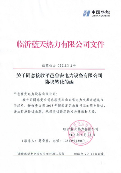附件2:關(guān)于同意接收平邑魯安電力設(shè)備有限公司協(xié)議轉(zhuǎn)讓的函