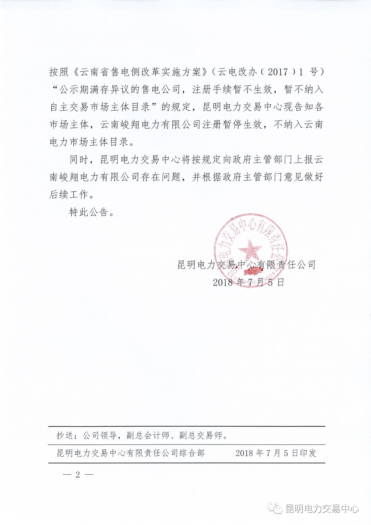 昆明電力交易中心日前發(fā)布了《昆明電力交易中心有限責(zé)任公司關(guān)于云南峻翔電力有限公司不納入市場(chǎng)主體目錄的公告》,經(jīng)核實(shí)云南峻翔電力有限公司涉及提供虛假注冊(cè)申請(qǐng)資料情況屬實(shí),注冊(cè)暫停生效,不納入市場(chǎng)主體目錄。