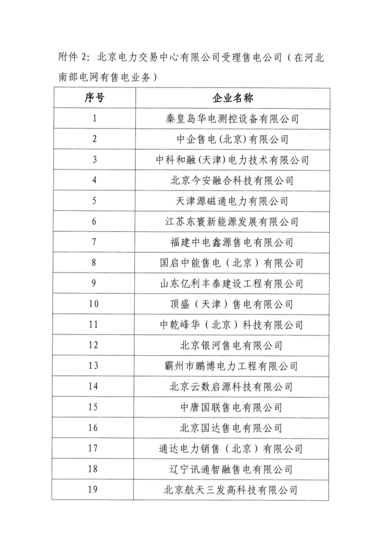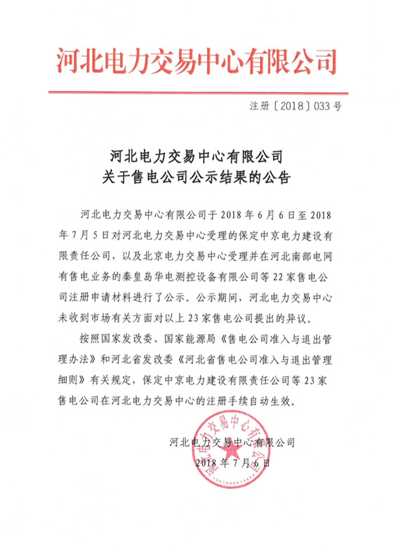 河北電力交易中心發(fā)布了1家和北京電力交易中心推送的22家售電公司公示結(jié)果的公告,保定中京電力建設(shè)有限責(zé)任公司和北京電力交易中心推送的2