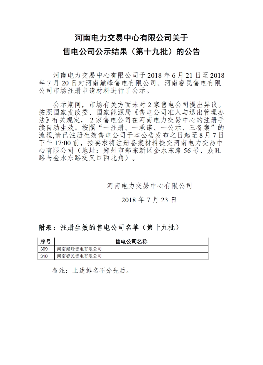 河南電力交易中心日前發(fā)布了《河南電力交易中心有限公司關(guān)于售電公司公示結(jié)果(第十九批)的公告》,河南巔峰售電有限公司、河南睿民售電有限