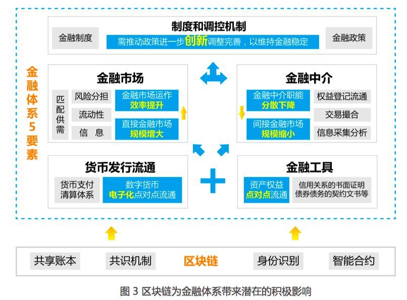 基于區(qū)塊鏈在金融資產權益證明發(fā)放與流通中的應用,區(qū)塊鏈將通過“一升一降三創(chuàng)新”,對貨幣發(fā)行流通、金融工具、金融市場、金融中介以及制度與調控機制等金融體系要素帶來潛在的積極影響。
