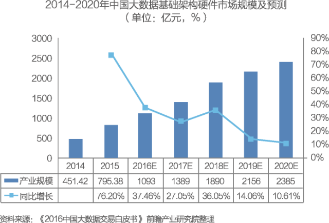 2014年,我國大數(shù)據(jù)相關(guān)硬件市場在451億元,到2015年已經(jīng)達(dá)到795億元的規(guī)模。隨著大數(shù)據(jù)相關(guān)產(chǎn)業(yè)的快速發(fā)展及應(yīng)用場景的擴(kuò)大,我國大數(shù)據(jù)硬件層市場將迎來一個(gè)嶄新的快速發(fā)展的局面。預(yù)計(jì)2016年市場規(guī)模將達(dá)到1093億元,2020年將突破至2385億元。