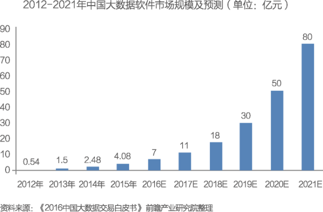 就中國大數(shù)據(jù)市場而言,大數(shù)據(jù)軟件市場占比較小。2012年,大數(shù)據(jù)軟件市場規(guī)模約為0.54億元,2014年市場規(guī)模約為2.48億元,前瞻預(yù)測,2016-2021年,中國大數(shù)據(jù)軟件市場規(guī)模年均復(fù)合增長率約為65%。預(yù)計(jì)到2021年,其市場規(guī)模達(dá)到80億元。