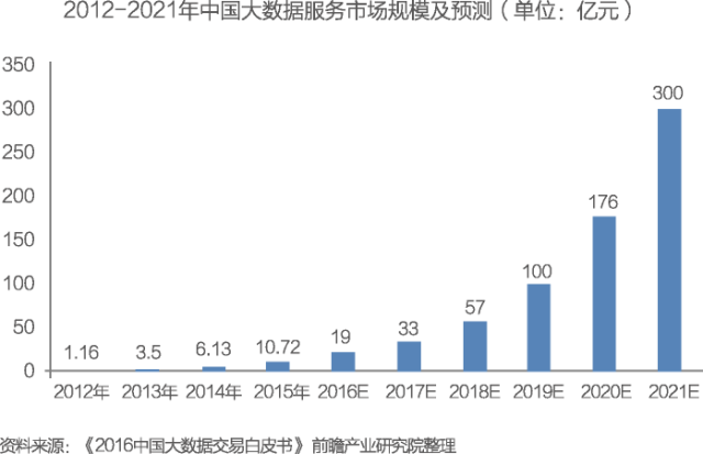 2012年,大數(shù)據(jù)服務(wù)市場規(guī)模約為1.16億元,2014年,其市場規(guī)模約為6.13億元;前瞻預(yù)測,2016-2021年,中國大數(shù)據(jù)服務(wù)市場年均復(fù)合增長率將超過軟件市場和硬件市場,年均復(fù)合增速將達(dá)到75%,到2021年,中國大數(shù)據(jù)服務(wù)市場規(guī)模有望達(dá)到300億元。