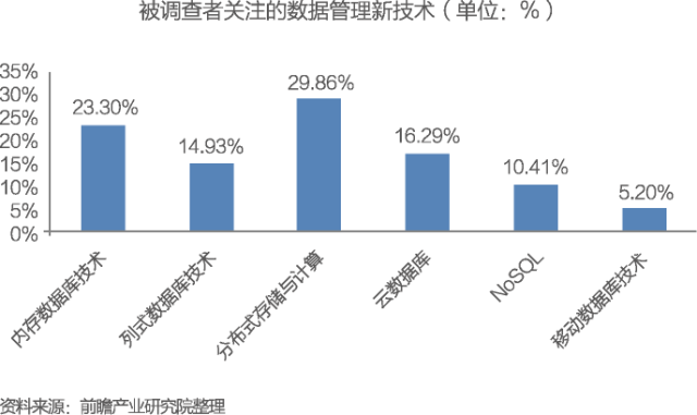 如下圖所示,分布式存儲與計(jì)算成為最受關(guān)注的數(shù)據(jù)管理新技術(shù),比例達(dá)到29.86%;其次是內(nèi)存數(shù)據(jù)庫技術(shù),占到23.30%;云數(shù)據(jù)庫排名第三,比例為16.29%。此外,列式數(shù)據(jù)庫技術(shù)、NoSQL也獲得較多關(guān)注。從調(diào)查結(jié)果來看,以Hadoop為代表的分布式存儲與計(jì)算已成為人們心目中大數(shù)據(jù)的關(guān)鍵技術(shù)。以SAP HANA為代表的內(nèi)存數(shù)據(jù)庫技術(shù)和以SQL Azure為代表的云數(shù)據(jù)庫技術(shù),也將成為占據(jù)重要地位的數(shù)據(jù)管理創(chuàng)新平臺。