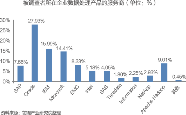 由下圖可以看出,企業(yè)現(xiàn)有數(shù)據(jù)產(chǎn)品的服務(wù)商,排在前六位的分別是Oracle(27.93%)、IBM(15.99%)、Microsoft(14.41%)、Apache Hadoop(9.01%)、EMC(8.33%)以及SAP(7.66%)。Oracle以絕對的優(yōu)勢拔得頭籌,可見其在數(shù)據(jù)庫、數(shù)據(jù)分析和大數(shù)據(jù)方面的地位。