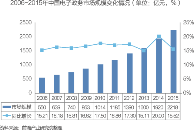 電子政務(wù)是中國信息化建設(shè)的重要內(nèi)容,是國家實(shí)施政府職能轉(zhuǎn)變,提高政府管理、公共服務(wù)和應(yīng)急能力的重要舉措,有利于帶動(dòng)整個(gè)國民經(jīng)濟(jì)和社會信息化的發(fā)展。在國家的大力支持和推動(dòng)下,中國電子政務(wù)取得了較大進(jìn)展,市場規(guī)模持續(xù)擴(kuò)大。據(jù)不完全統(tǒng)計(jì),2015年,電子政務(wù)市場規(guī)模約為2218億元,同比增長15.52%。
