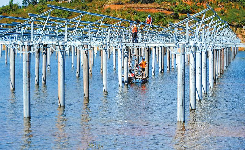 西昌市西溪鄉(xiāng)興國寺水庫,建設(shè)中的“漁光一體”光伏電站。該項目是我省首個智能魚塘光伏電站。建成后將實現(xiàn)水上清潔發(fā)電、水下現(xiàn)代化養(yǎng)殖、有機種植、生態(tài)農(nóng)業(yè)觀光旅游的循環(huán)經(jīng)濟模式。