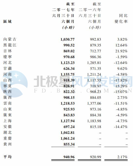 大唐新能源2017上半年風電場按地區(qū)平均利用小時數據