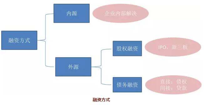 內(nèi)源融資主要是企業(yè)內(nèi)部資金融通,內(nèi)部解決資金問(wèn)題,不再需要向外部借錢。外源融資主要來(lái)自企業(yè)外部資金的拆借,分股權(quán)和債權(quán)。股權(quán)包括IPO(InitialPublicOffering)和新三板等等;債務(wù)融資包括直接融資和間接融資,直接融資不需金融機(jī)構(gòu)作為媒介,而間接融資是通過(guò)金融機(jī)構(gòu),如銀行等作為媒介由借款人向貸款人進(jìn)行融資。