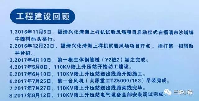 2017年8月,福清興化灣樣機試驗風(fēng)場(一期)2臺機組順利完成吊裝,完全具備投產(chǎn)發(fā)電條件,創(chuàng)造了全球單個海上風(fēng)電場建設(shè)投產(chǎn)最快的“三峽速度”。