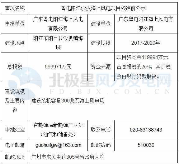 北極星風(fēng)力發(fā)電網(wǎng)獲悉,廣東發(fā)改委近日核準(zhǔn)粵電陽江沙扒海上風(fēng)電項目。該項目總裝機(jī)300兆瓦,總投資599971萬元,建設(shè)期限2017-2020年。以下為公示原文: