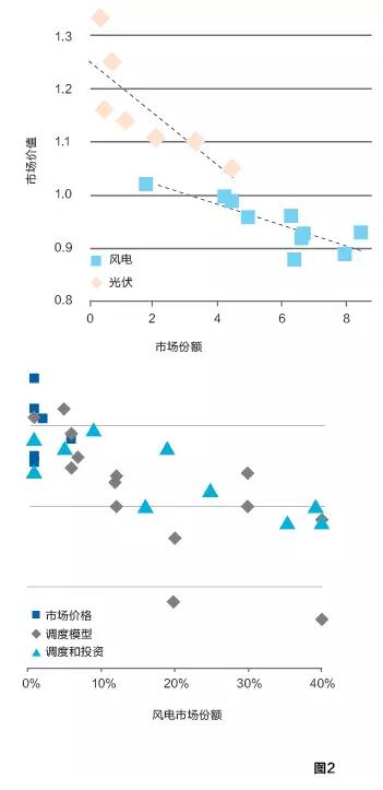 因此,這種情況下,風(fēng)電與化石能源發(fā)電,將成為具有明顯區(qū)別的兩種產(chǎn)品。在30%的份額下,風(fēng)電的價值可能只有市場平均電力價格的50%-80%了(圖2)。其市場的最優(yōu)份額,取決于其自身的成本與其相應(yīng)價值的比較,而不是彼此間的比較(比如基于度電成本)。
