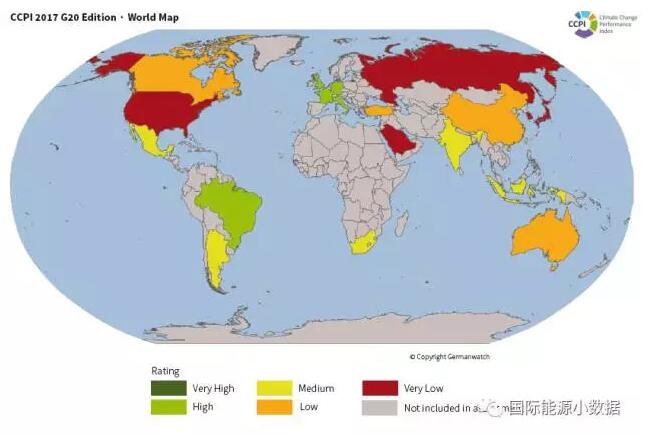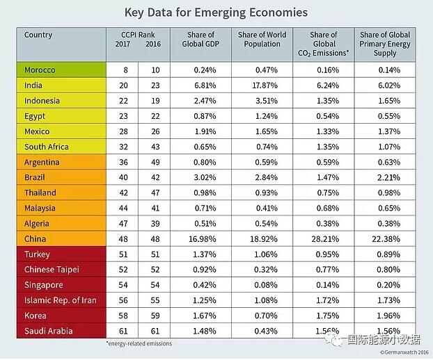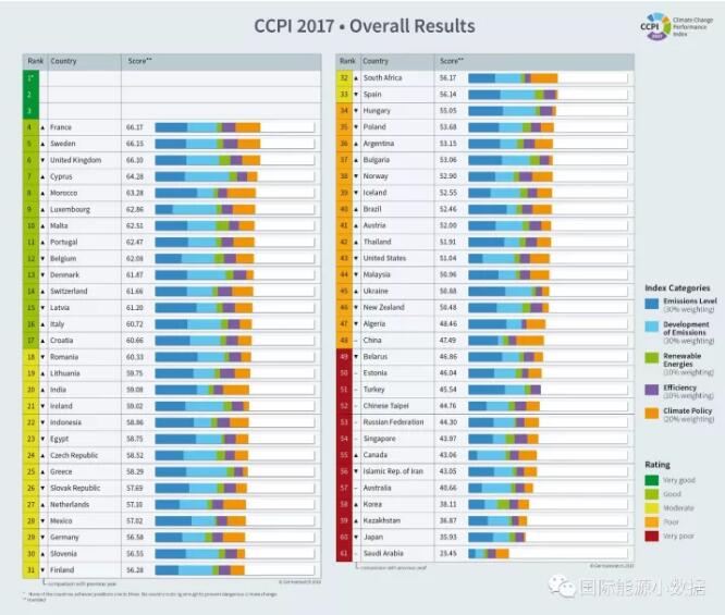 按照以上指標(biāo)評(píng)估占全球能源相關(guān)碳排放90%以上的58個(gè)國(guó)家的氣候績(jī)效,前三名出缺;核電大國(guó)法國(guó)以第4名的成績(jī)高居榜首,而以能源轉(zhuǎn)型著稱的德國(guó)僅排在29位,中國(guó)則排在第48位。