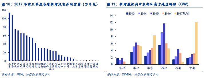 4)最后是風(fēng)電建設(shè)向中東部和南部等消納能力強(qiáng)的地區(qū)轉(zhuǎn)移。風(fēng)電“十三五”規(guī)劃提出, “十三五”期間“三北”地區(qū)在基本解決棄風(fēng)問題的基礎(chǔ)上,通過促進(jìn)就地消納和利用現(xiàn)有通道外送,新增風(fēng)電并網(wǎng)裝機(jī)容量 35GW,累計并網(wǎng)容量達(dá)到 135GW,相比“十二五”同比增長 35%;中東部及南部地區(qū)新增并網(wǎng)容量 42GW,累計并網(wǎng)裝機(jī)容量達(dá)到 70GW,同比增長 150%。從 2017 年前三季度各省市新增并網(wǎng)容量來看,棄風(fēng)限電嚴(yán)重的新疆(0.3GW)、甘肅(0)、寧夏(0)等地勢頭得到有效遏制,風(fēng)電新增并網(wǎng)容量較多的地區(qū)為青海、山東、河南、河北等消納能力較強(qiáng)的省份。