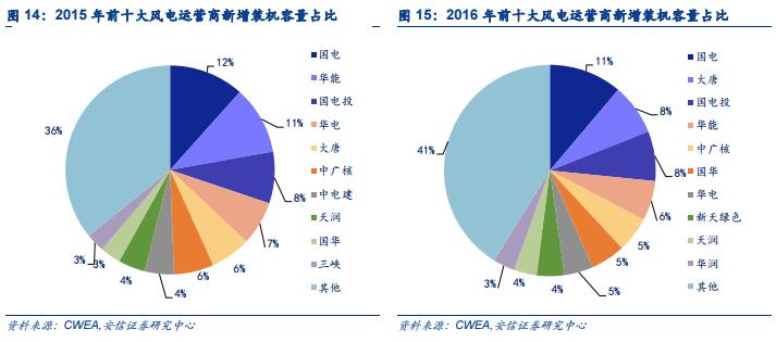 行業(yè)集中度下滑,投資主體多元化。由于風(fēng)電一般單個項目規(guī)模較大,對資金規(guī)模及融資能力要求較高,國內(nèi)風(fēng)電開發(fā)主體為以五大發(fā)電集團(tuán)(國電、華電、華能、大唐、國電投)為主的央企。2016 年,中國風(fēng)電有新增裝機(jī)的開發(fā)商企業(yè)超過 100 家,前十家裝機(jī)容量超過 1300 萬千瓦,占比達(dá)到 58.8%,累計裝機(jī)前十家的開發(fā)企業(yè)裝機(jī)容量超過 1 億千瓦,占比達(dá)到 69.4%。但隨著風(fēng)電行業(yè)的快速發(fā)展以及風(fēng)電運(yùn)營具備較好的經(jīng)濟(jì)性,參與風(fēng)電投資的企業(yè)越來越多,2016 年前十大開發(fā)企業(yè)市場份額同比下降 6.6%,且在 2016 年新增裝機(jī)容量的前十名中,民營企業(yè)數(shù)量從 2015 年的 1 家(天潤)增長至 2 家(天潤、新天綠色)。