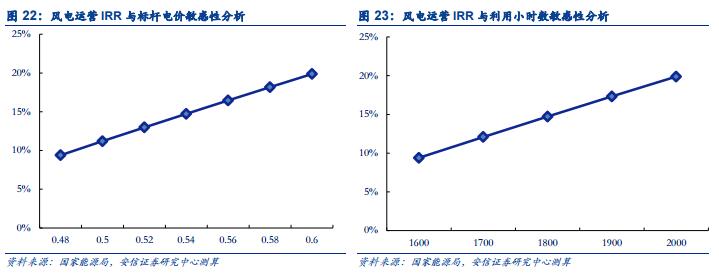 另外,通過(guò)敏感性分析,我們發(fā)現(xiàn) IRR 與利用小時(shí)數(shù)和標(biāo)桿上網(wǎng)電價(jià)均呈現(xiàn)正相關(guān)關(guān)系,且利用小時(shí)數(shù)提升和標(biāo)桿電價(jià)下調(diào)對(duì) IRR 影響均較大。