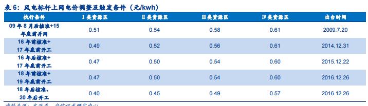 2016 年 12 月底國(guó)家發(fā)改委提出下調(diào)陸上風(fēng)電上網(wǎng)電價(jià),2018 年 1 月 1 日之后,一類至四類資源區(qū)新核準(zhǔn)建設(shè)陸上風(fēng)電標(biāo)桿上網(wǎng)電價(jià)分別調(diào)整為每千瓦時(shí) 0.40 元、0.45 元、0.49 元、 0.57 元,較當(dāng)前上網(wǎng)電價(jià)下調(diào)幅度分別為 14.89%,10%,9.26%,5%。另外,此次電價(jià)下調(diào)的觸發(fā)條件由原來(lái)的并網(wǎng)變更為核準(zhǔn)+兩年內(nèi)開(kāi)工。