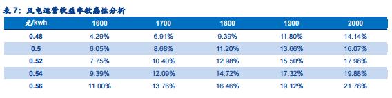 較高的風(fēng)電運(yùn)營(yíng)收益率是推動(dòng)行業(yè)發(fā)展的核心驅(qū)動(dòng)因素,同時(shí)也是風(fēng)電招標(biāo)量維持高位的根本原因。影響風(fēng)電運(yùn)營(yíng)內(nèi)部收益率的核心因素是利用小時(shí)數(shù)和標(biāo)桿上網(wǎng)電價(jià)。我們以三類資源區(qū)為例,按照我們的假設(shè),在風(fēng)電利用小時(shí)數(shù)為 1900 小時(shí),標(biāo)桿上網(wǎng)電價(jià)為 0.54 元/kwh 的情況下,風(fēng)電運(yùn)營(yíng)收益率在 15%左右。