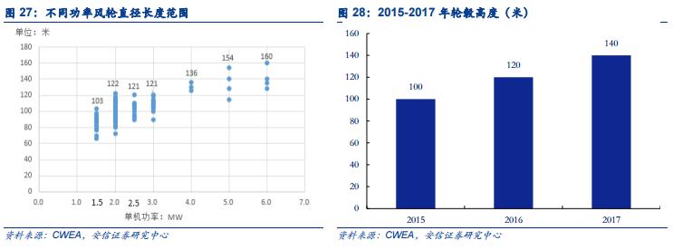 與此同時,風輪直徑也出現(xiàn)加大的趨勢,輪轂高度也在不斷增加。1.5MW 的風輪直徑從 66m 增長到 121m,2.0MW 的風輪直徑從 72m 增長到 122 米。在全國吊裝的風電機組中,輪轂中心高度范圍在 65m~120m,2016 年最大值 120m 比 2015 年增長 20m,2017 年已經(jīng)出現(xiàn) 140m。雖然分散式風電單位開發(fā)成本更高,但技術(shù)的進步帶來發(fā)電效率的提升使得位于低風速區(qū)的分散式項目目前也具備較好的經(jīng)濟性。
