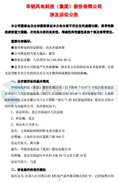 華銳風(fēng)電近日收到北京市海淀區(qū)人民法院做出的(2017)京 0108 民初 26148 號(hào)《應(yīng)訴通知書(shū)》、上海歐際柯特回轉(zhuǎn)支承有限公司的《民事起訴狀》,原告以買(mǎi)賣(mài)合同糾紛為由起訴華銳風(fēng)電。本次涉案金額達(dá)54,748,034.00 元。以下為具體情況: