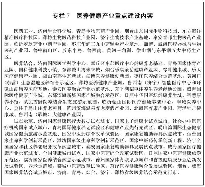 深入實(shí)施“健康山東”戰(zhàn)略,促進(jìn)醫(yī)療、養(yǎng)老、養(yǎng)生、體育等多業(yè)態(tài)融合發(fā)展,打造全方位、全周期健康服務(wù)產(chǎn)業(yè)鏈,創(chuàng)建國(guó)家醫(yī)養(yǎng)結(jié)合示范省。到2022年,醫(yī)養(yǎng)健康產(chǎn)業(yè)增加值力爭(zhēng)達(dá)到11500億元,占地區(qū)生產(chǎn)總值的11.5%。