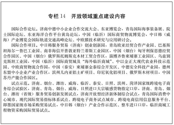 構(gòu)建開放型經(jīng)濟(jì)新體制。充分借鑒自由貿(mào)易試驗(yàn)區(qū)改革試點(diǎn)經(jīng)驗(yàn),在濟(jì)南、青島、煙臺(tái)市,依托國(guó)家級(jí)新區(qū)、國(guó)家級(jí)經(jīng)濟(jì)技術(shù)開發(fā)區(qū)、國(guó)家級(jí)高新技術(shù)開發(fā)區(qū)、海關(guān)特殊監(jiān)管區(qū),以及濟(jì)南新舊動(dòng)能轉(zhuǎn)換先行區(qū),加快體制機(jī)制創(chuàng)新。支持青島積極創(chuàng)造條件,探索建設(shè)自由貿(mào)易港。支持濟(jì)南開展構(gòu)建開放型經(jīng)濟(jì)新體制綜合試點(diǎn)。推動(dòng)濟(jì)寧、日照、淄博、青島空港、即墨等綜合保稅區(qū)盡早獲批,支持其他符合條件的市申建海關(guān)特殊監(jiān)管區(qū)域,推進(jìn)現(xiàn)有海關(guān)特殊監(jiān)管區(qū)域延伸服務(wù)功能。推進(jìn)威海中韓自貿(mào)區(qū)地方經(jīng)濟(jì)合作示范區(qū)、中韓(煙臺(tái))產(chǎn)業(yè)園建設(shè)。全面實(shí)行準(zhǔn)入前國(guó)民待遇加負(fù)面清單管理制度,加強(qiáng)外商投資企業(yè)事中事后監(jiān)管,探索“無感知”和“低感知”監(jiān)管方式。推行“服務(wù)大使”制度,加強(qiáng)重點(diǎn)外資企業(yè)點(diǎn)對(duì)點(diǎn)直通包辦服務(wù)。擴(kuò)大服務(wù)業(yè)對(duì)外開放,根據(jù)國(guó)家部署,有序放開育幼養(yǎng)老、建筑設(shè)計(jì)、會(huì)計(jì)審計(jì)、商貿(mào)物流、電子商務(wù)等服務(wù)業(yè)領(lǐng)域準(zhǔn)入限制。開展跨境電子商務(wù)人民幣結(jié)算、跨境資產(chǎn)轉(zhuǎn)讓政策創(chuàng)新和融資租賃試點(diǎn)。