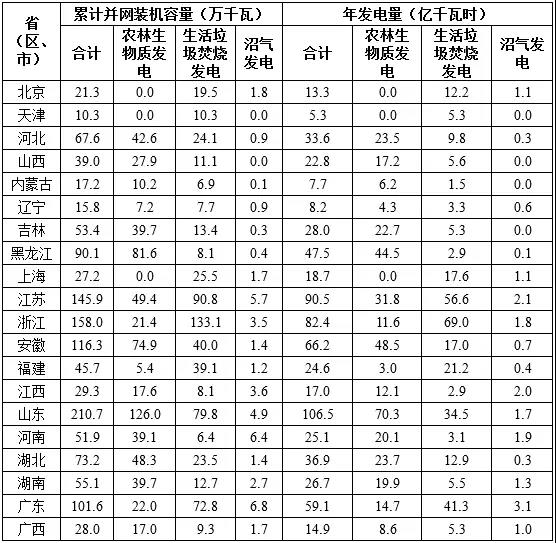 截至2017年底,全國共有30個省(區(qū)、市)投產了747個生物質發(fā)電項目,并網(wǎng)裝機容量1476.2萬千瓦(不含自備電廠),年發(fā)電量794.5億千瓦時。其中農林生物質發(fā)電項目271個,累計并網(wǎng)裝機700.9萬千瓦,年發(fā)電量397.3億千瓦時;生活垃圾焚燒發(fā)電項目339個,累計并網(wǎng)裝機725.3萬千瓦,年發(fā)電量375.2億千瓦時;沼氣發(fā)電項目137個,累計并網(wǎng)裝機50.0萬千瓦,年發(fā)電量22.0億千瓦時。生物質發(fā)電累計并網(wǎng)裝機排名前四位的省份是山東、浙江、江蘇和安徽,分別為210.7萬、158.0萬、145.9萬和116.3萬千瓦;年發(fā)電量排名前四位的省份是山東、江蘇、浙江和安徽,分別是106.5億、90.5億、82.4億和66.2億千瓦時。2017年各省(區(qū)、市)各類生物質發(fā)電并網(wǎng)裝機及發(fā)電量如下: