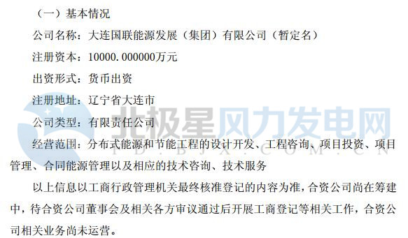 由大連市國資委牽頭,經(jīng)各方友好協(xié)商,華銳風(fēng)電科技(集團(tuán))股份有限公司、大連市熱電集團(tuán)有限公司、大連重工˙起重集團(tuán)有限公司、大連冰山集團(tuán)工程有限公司(以下簡稱“冰山工程”)、大連融科儲(chǔ)能技術(shù)發(fā)展有限公司擬共同出資設(shè)立“大連國聯(lián)能源發(fā)展(集團(tuán))有限公司” (暫定名),合資公司的注冊(cè)資本為人民幣 10,000 萬元,其中華銳風(fēng)電擬以貨幣形式出資人民幣 4,000 萬元,持股比例為 40%。