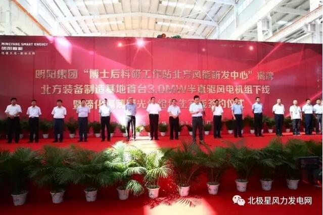 8月10日,明陽集團 博士后科研工作站北方風(fēng)能研究中心揭牌暨北方裝備制造基地首臺3 0MW半直驅(qū)風(fēng)電機組下線儀式在錫林郭勒盟錫林浩特市明陽工業(yè)園隆重舉行。內(nèi)蒙古自治區(qū)、錫林郭勒盟、錫林浩特市各級領(lǐng)導(dǎo)以及明