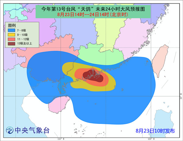 大風預報:8月23日14時至8月24日14時,南海北部、臺灣海峽、瓊州海峽、北部灣以及廣東沿海、福建南部沿海、海南東部和北部沿海、廣西沿海以及廣東南部和廣西東部地區(qū)將有7-10級大風,珠江口附近地區(qū)將有11-13級大風,“天鴿”中心經(jīng)過的附近海域或地區(qū)的風力有14-15級大風,陣風可達16-17級。