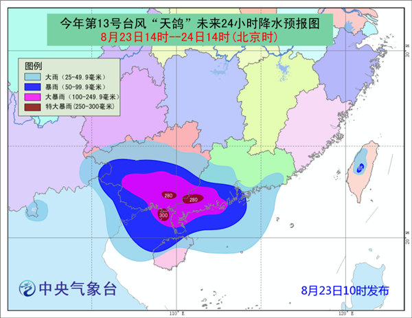 降水預報:8月23日14時至8月24日14時,廣東西部和沿海地區(qū)、廣西大部、海南島北部、臺灣中西部等地有大到暴雨,其中,廣東西南部、廣西南部等地部分地區(qū)有大暴雨,局地特大暴雨(250~300毫米)。