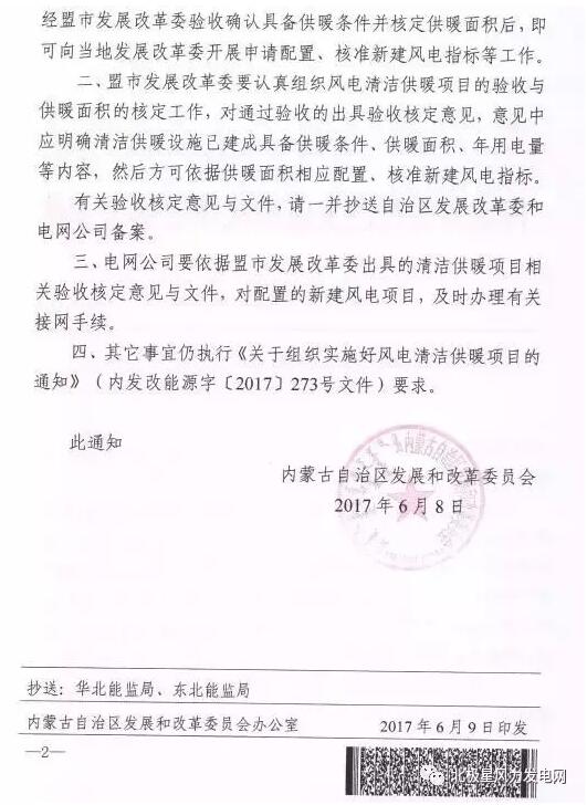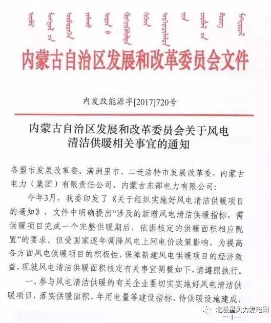 內(nèi)蒙古發(fā)改委近日發(fā)布了《關(guān)于風(fēng)電清潔供暖相關(guān)事宜的通知》。通知指出參與風(fēng)電清潔供暖的有關(guān)企業(yè)待供暖設(shè)施建成后,經(jīng)盟市發(fā)展改革委驗(yàn)收確認(rèn)具備供暖條件并核定供熱面積后,即可向當(dāng)?shù)匕l(fā)展改革委開展申請配置、核準(zhǔn)新建風(fēng)電項(xiàng)目指標(biāo)等工作。這一政策調(diào)整,就意味著目前建成及在建的風(fēng)電項(xiàng)目在供暖設(shè)施建成通過驗(yàn)收后,即可申請配置風(fēng)電指標(biāo),有望按照0.47元/千瓦時(shí)的上網(wǎng)電價(jià)執(zhí)行。以下為通知原文: