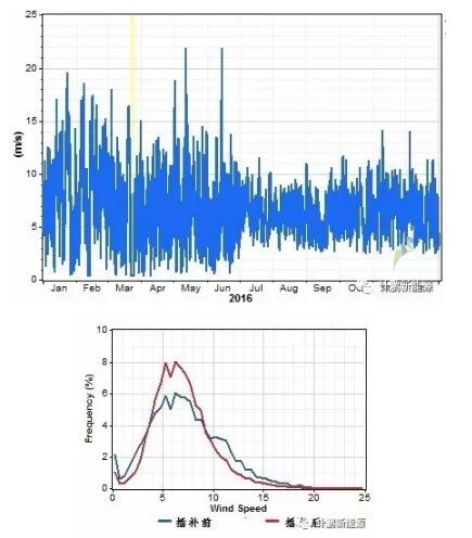 因此在風資源評估中,以半年的測風數(shù)據(jù)作為原始數(shù)據(jù)進行評估,以再分析數(shù)據(jù)作為插補源數(shù)據(jù),待插補為完整一年的數(shù)據(jù)后,會改變風速的風頻,這樣便引入一個很大的不確定性,并且對后續(xù)計算、微觀選址等工作的展開均會有負面影響。