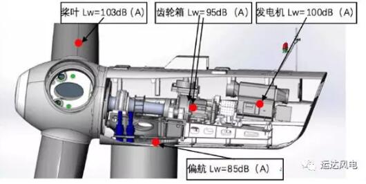 風(fēng)電機(jī)組噪音行程原因風(fēng)力發(fā)電機(jī)組噪聲源有槳葉噪聲及艙內(nèi)噪聲,艙內(nèi)噪聲包括齒輪箱噪聲、發(fā)電機(jī)噪聲、偏航系統(tǒng)噪聲等(見圖1)。由于齒輪箱、發(fā)電機(jī)等噪聲源位于機(jī)艙罩內(nèi),機(jī)艙罩具很強(qiáng)的隔聲吸聲性能,而槳葉完全暴露在空氣中,所以對(duì)風(fēng)電場(chǎng)居民的噪聲干擾,槳葉噪聲占據(jù)主導(dǎo)。