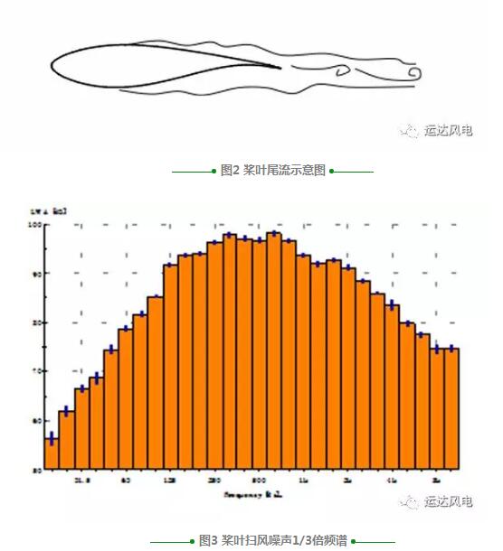 風(fēng)輪在旋轉(zhuǎn)過程中,槳葉與空氣產(chǎn)生較大的相對(duì)速度,葉尖線速度約80m/s,空氣從槳葉的前緣流向后緣,受槳葉弦長、槳矩角、相對(duì)風(fēng)速、大氣壓等因素的影響,槳葉后緣附近產(chǎn)生不同尺度、不同強(qiáng)度的渦流(見圖2),這是槳葉噪聲的根本來源,不同尺度渦流的存在導(dǎo)致槳葉掃風(fēng)噪聲呈寬頻特性,渦流的強(qiáng)度則決定了噪聲的強(qiáng)度。