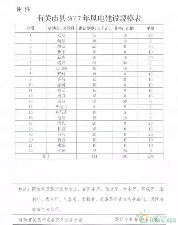 近期,河南省發(fā)改委下發(fā)了《關(guān)于下達(dá)2017年風(fēng)電建設(shè)規(guī)模的通知》。通知顯示,河南省2017年風(fēng)電建設(shè)規(guī)模指標(biāo)共計(jì)411萬(wàn)千瓦,其中山地風(fēng)電181萬(wàn)千瓦,平原風(fēng)電230萬(wàn)千瓦。以下為原文件:
