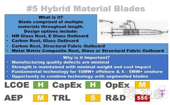 使用混合材料的基本概念是允許在葉片的戰(zhàn)略點(diǎn)處的可變材料密度:可以最小化重量,同時(shí)結(jié)構(gòu)完整性得到加強(qiáng)??赡茏龀龅母淖儼▽?duì)于渦輪機(jī)的翼梁、腹板或負(fù)載較高的底部使用高模量玻璃或碳,同時(shí)為外側(cè)保留更傳統(tǒng)的玻璃。它可以節(jié)省很大的成本,利用現(xiàn)有的基礎(chǔ)設(shè)施,一次性利用新的創(chuàng)新。