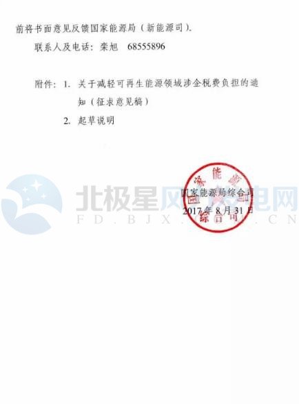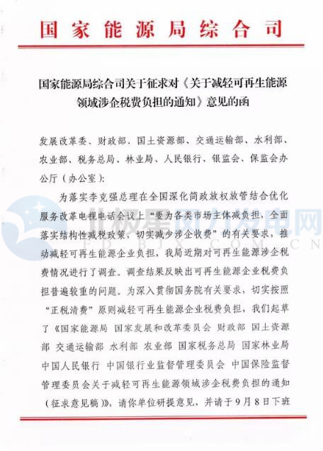 國(guó)家能源局綜合司近日印發(fā)《關(guān)于減輕可再生能源領(lǐng)域涉企稅費(fèi)負(fù)擔(dān)的通知》。財(cái)政部、國(guó)土資源部、能源局等12部委聯(lián)合發(fā)布征求意見稿,力求為可再生能源行業(yè)減負(fù)。文件根據(jù)可再生能源企業(yè)稅費(fèi)負(fù)擔(dān)普遍較重的實(shí)際情