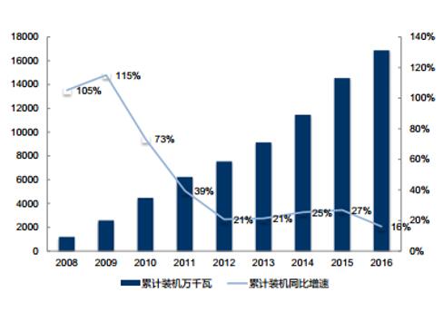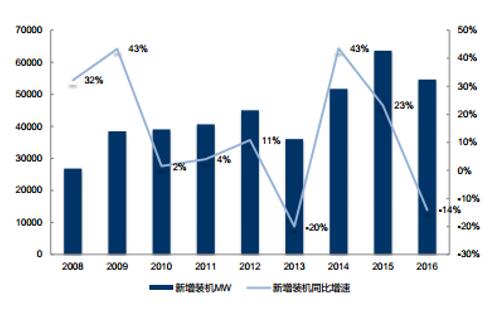 相比之下, 海上風(fēng)電增長(zhǎng)增速高于陸上風(fēng)電,成為未來(lái)風(fēng)電行業(yè)重要的增量。 事實(shí)上,伴隨著陸上風(fēng)電可開(kāi)發(fā)的區(qū)域逐漸減少,而海上風(fēng)電資源豐富,且沿海地區(qū)經(jīng)濟(jì)發(fā)達(dá),電網(wǎng)容量更大,風(fēng)電接入條件更好,近年來(lái)風(fēng)電行業(yè)逐漸由陸上向近海發(fā)展。 2001 年-2015年全球海上風(fēng)電累計(jì)裝機(jī)容量復(fù)合增長(zhǎng)率 43.51%,2015年累計(jì)裝機(jī)容量 12167MW。2016 年全球海上風(fēng)電市場(chǎng)新增裝機(jī)容量 2217MW,同比下滑 36%。 截止 2016 年底,全球海上風(fēng)電累計(jì)裝機(jī)容量達(dá)到 14384MW。