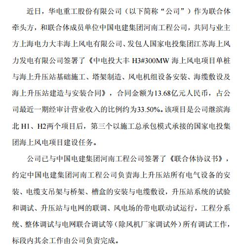 華電重工昨日發(fā)布公告稱,近日公司作為牽頭方,和聯(lián)合體成員中國電建河南工程公司,共同與業(yè)主方上海電力大豐海上風電有限公司、發(fā)包人國家電投集團江蘇海上風力發(fā)電有限公司簽署了《中電投大豐 H3#300MW 海上風電項目單樁 與海上升壓站基礎施工、塔架制造、風電機組設備安裝、海纜敷設及 海上升壓站建造與安裝合同》,合同金額為13.68億元人民幣,占公司最近一期經(jīng)審計營業(yè)收入的比例約為33.5%。