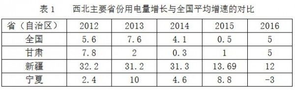 從2013年開始,西北主要省份的社會用電量增長出現(xiàn)明顯下降和波動(見表1),新疆社會用電量波動最大,從2013、2014年的31%下降到2016年的12%,降幅近20個百分點。寧夏、青海到2016年變成了負增長。只有甘肅從2013年的2.0%上升到2016年的5.0%,電力需求增速與全國平均持平。而東部、中部用電量同比分別增長5.9%、5.4%,是全國用電增長的主要拉動力。