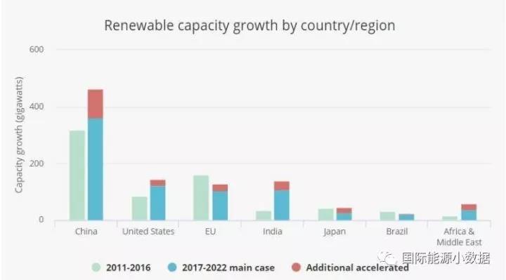 過去對于可再生能源發(fā)展規(guī)模預測曾經偏保守的IEA現(xiàn)在預測,2017-2022年間全球可再生能源新增裝機將至少達到920吉瓦(其中風電321吉瓦、光伏438吉瓦),其中363吉瓦(39%)將來自中國。如果各國政策支持力度加大的樂觀情形下,2017-2022年間可再生能源新增裝機可能達到1150吉瓦,其中464吉瓦(40%)來自中國。