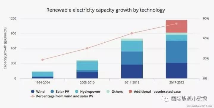 國際能源署發(fā)布2017年可再生能源報告,確認2016年全球新增可再生能源裝機165吉瓦,其中太陽能光伏裝機達到74吉瓦(約46%來自中國),首次超過煤電新增裝機(57吉瓦)。過去對于可再生能源發(fā)展規(guī)模預測曾經偏保守的IE