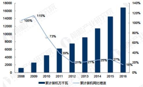 據(jù)前瞻產(chǎn)業(yè)研究院發(fā)布的《海上風(fēng)電行業(yè)市場(chǎng)前瞻與投資規(guī)劃分析報(bào)告》數(shù)據(jù)顯示,2016年中國(guó)(除臺(tái)灣地區(qū)外)風(fēng)電新增裝機(jī)容量為2337萬(wàn)千瓦,同比下降24%;累計(jì)裝機(jī)容量達(dá)1.69億千瓦。