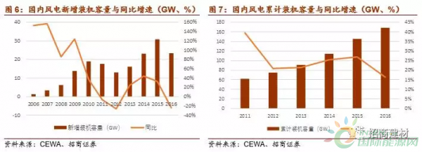國內(nèi)風電新增裝機容量快速發(fā)展,近年有所波動,總體上進入平穩(wěn)增長的階段。2006-2016年的10年間,年均復合增速超過30%,是當之無愧的成長性行業(yè)。