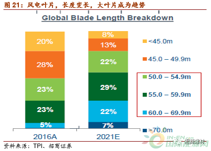 大葉片成為趨勢。全球的風電葉片長度,目前以45-59.9米為主導,占比超過70%,預計未來,到2021年,60-69.9米的葉片占比將提升到20%。