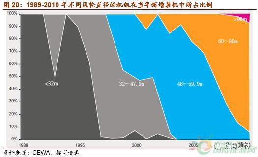 風電機組風輪直徑進一步加大。對低風速風區(qū)開發(fā)的重視度增強,降低單位成本,以及國內(nèi)風電招投標體制一般以千瓦功率為單位進行價格的對比,風電機組往大功率發(fā)展,風輪直徑更大,葉片長度更長的產(chǎn)品更受市場歡迎。不同風輪直徑的機組,2000年前后,以32-47.9米的為主導;2005年前后,以48-59.9米的為主導,而2010年后,60-90米的成為了主導。