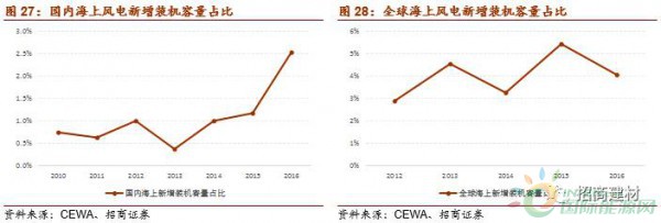 國內(nèi)海上風電新增裝機容量的占比,從之前徘徊在1%左右,2016年快速提升到2.5%,進入加速發(fā)展期。全球海上風電同樣占比較低,處于加速發(fā)展的前期。
