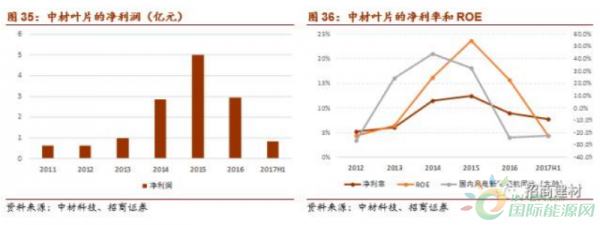 將進入向上周期,業(yè)績彈性大。凈利潤的波動比收入大,凈利率和ROE的變化趨勢與國內(nèi)風電新增裝機容量同比變化基本一致。由于2015年的搶裝透支需求,2016年至今,風電行業(yè)較為低迷,處于底部,隨著新增裝機回暖,中材葉片的業(yè)績會進入上升周期。